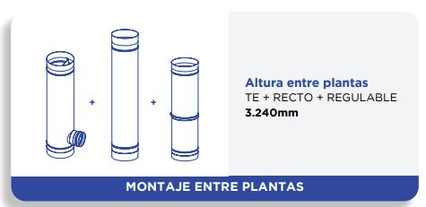 - Si la instalación es en acero galvanizado, en cada planta habría 1 te shunt lg 1000mm con ramal interior y conexión, 1 tramo extensible Lg 1340 - 2440mm con ramal interior y 1 abrazadera a pared.