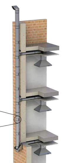 Chimenea modular colectiva aislada de doble pared que permite la evacuación de los humos de las calderas murales a cubierta. La toma de aire se realiza a través de otro conducto independiente o desde la propia fachada.